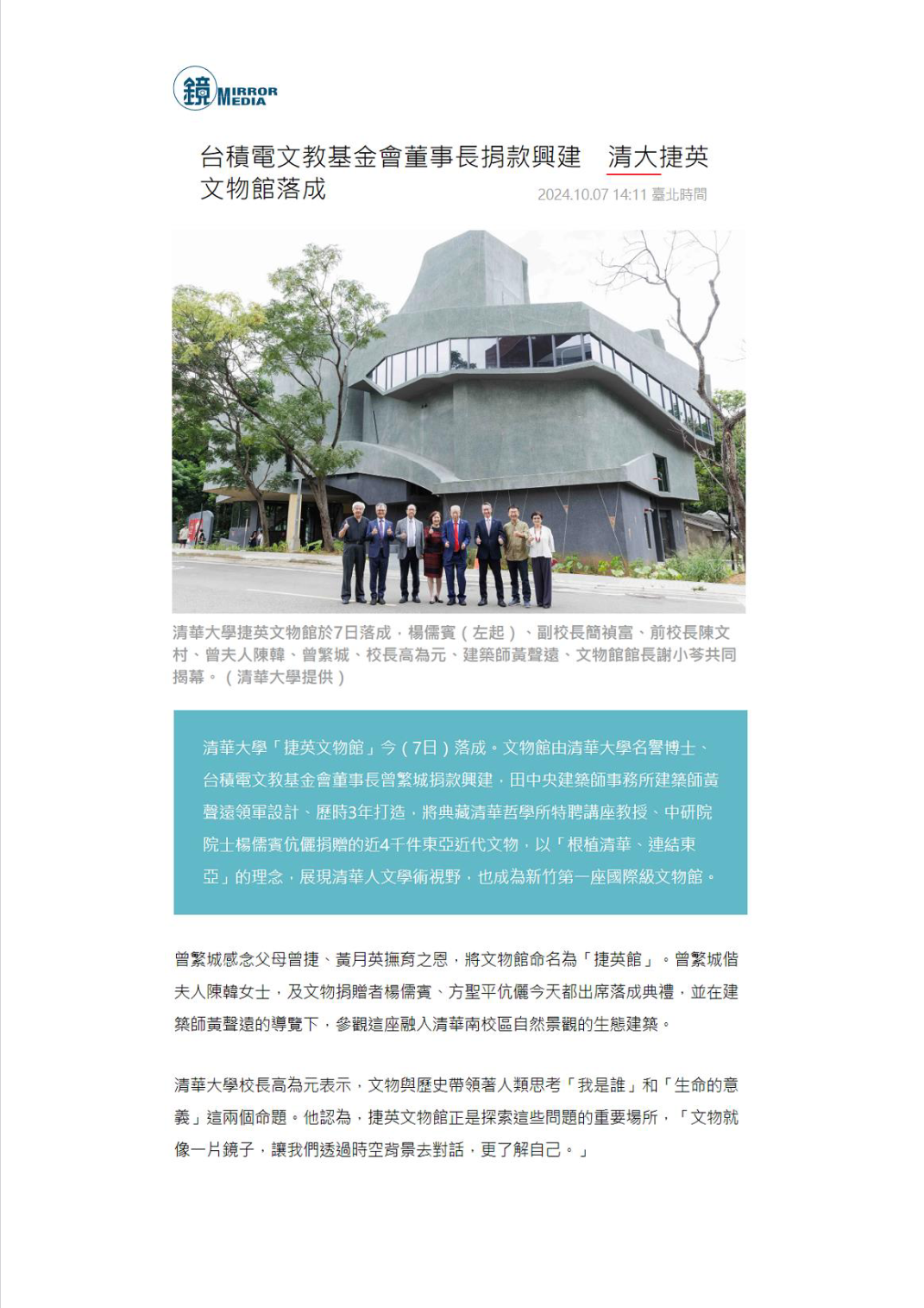 台積電文教基金會董事長捐款興建 清大捷英文物館落